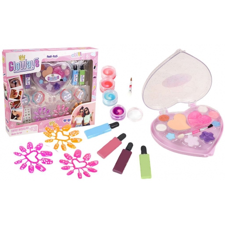 Fard à paupière et fard à joues, 4 flacons de vernis à ongles, 4 brillants à lèvres, plache de stickers à ongles et des faux ongles