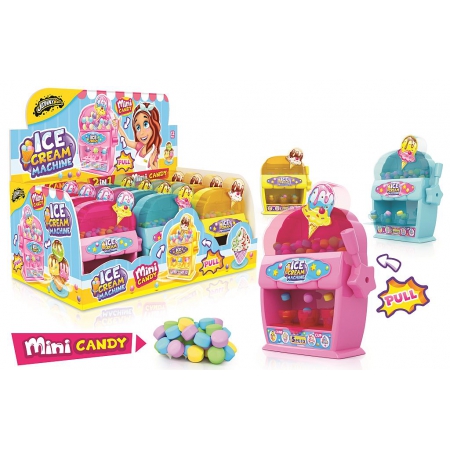 Machine à glace miniature de couleur rose, jaune et bleue avec des bonbons dextroses billes goût fruits à l'intérieur. On l'actionne en abaissant le levier latéral