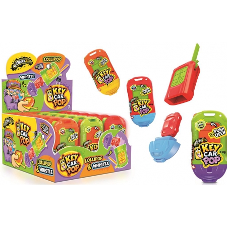 KEY CAR POP JOHNY BEE Contient un sifllet et une sucette. Parfum, framboise, pomme verte Dimension : 5*2.5*10 cm