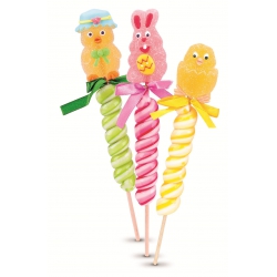Cette sucette, à la forme torsadée, est accompagnée d'un lapin, ou d'un poussin.