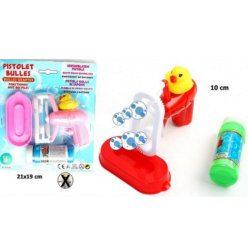 PISTOLET BULLE DE SAVON CANARD A PILES Dimension : pistolet 10 cm Dimension de la carte : 21*19 cm Fonctionne avec 2 piles LR06 non fournies