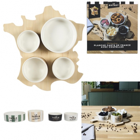 Ce set original regroupe 4 coupelles en porcelaine décorées sur leur planche en bois en forme de carte de France. De l'apéritif au dessert, mettez à l'honneur les régions gourmandes de France. Présentez vos plateaux de fromages accompagnés de mets régionaux comme les noix de Grenoble, les abricots secs du Roussillon, du beurre normand par exemple... Idée cadeau originale pour les gastronomes!