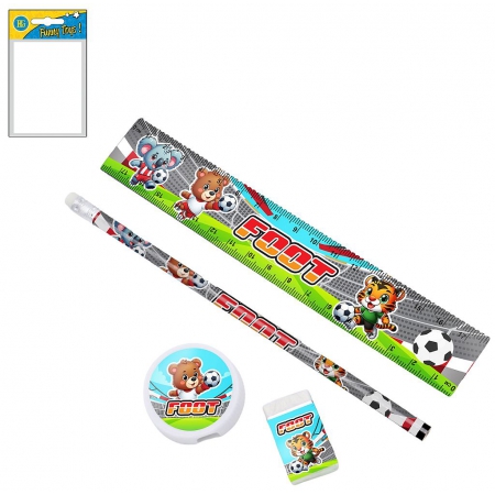 Set papeterie foot 19 cm, comprenant 4 accessoires : règle, crayon à papier, gomme et taille-crayon. Idéal pour les fans de football, les écoles et les kermesses !