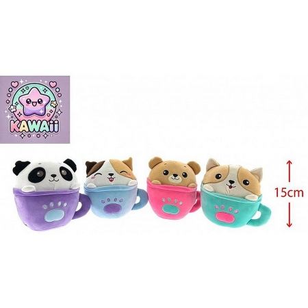 PELUCHE ANIMAL TASSE KAWAII 15 CM Craquez pour cette adorable peluche animal nichée dans une tasse, hauteur 15 cm 4 modèles assortis