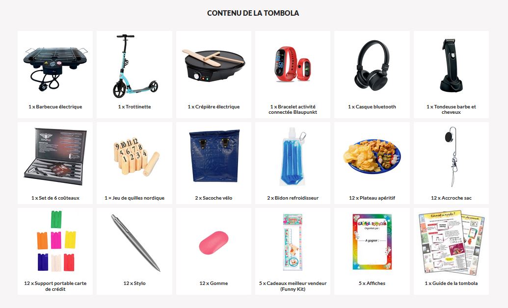 0 MINUTE DE PERDU : Tout est prêt. Nous vous fournissons les tickets personnalisés avec votre texte plus tous les lots. Vous trouverez également dans votre colis (expédié sous 3 jours par un transporteur spécialisé) : des cadeaux meilleurs vendeurs, des affiches et un livret conseil. Ainsi vos bénévoles gagnent du temps pour se consacrer à la bonne gestion de votre club.