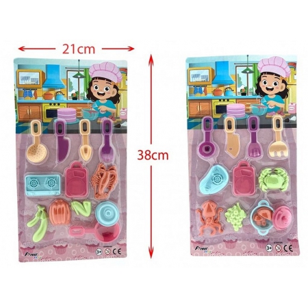 PANOPLIE DINETTE 38 CM Blister comprenant des ustensiles de cuisine et des ingrédients. Dimensions blister: 38 X 21cm