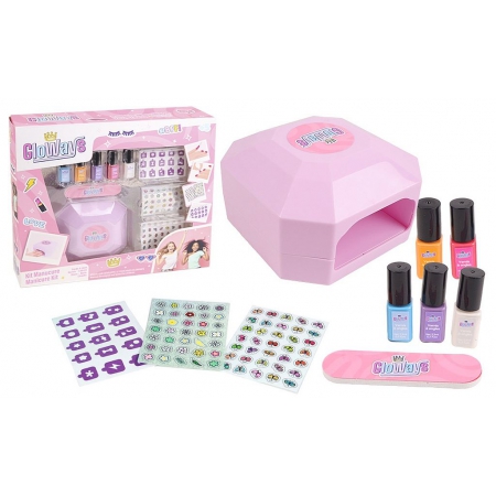 COFFRET MANUCURE ET MACHINE SECHE ONGLES Contient 6 vernis à ongles, 3 planches de stickers Piles non incluses Dimension du produit : 6.5*11*11 cm Dimension du produit emballé : 26*28*6.5 cm Dès 5 ans