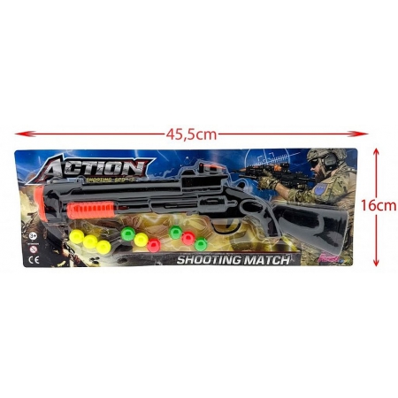 Fusil jouet pour enfants avec balles et cibles multicolores. Dimensions 45,5x16 cm. Parfait pour des jeux d'adresse et de tir sécurisés.