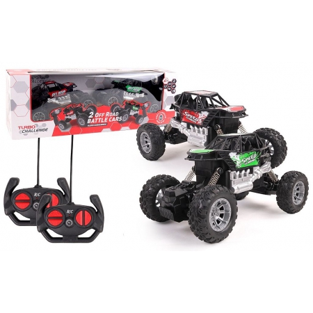COFFRET 2 OFF ROAD BATTLE RADIOCOMMANDE Dimension voiture : 13*21*12 cm Dimension du coffret : 17.5*52*14.5 cm 2.4 GHZ 2 Télécommandes Piles incluses Dès 6 ans